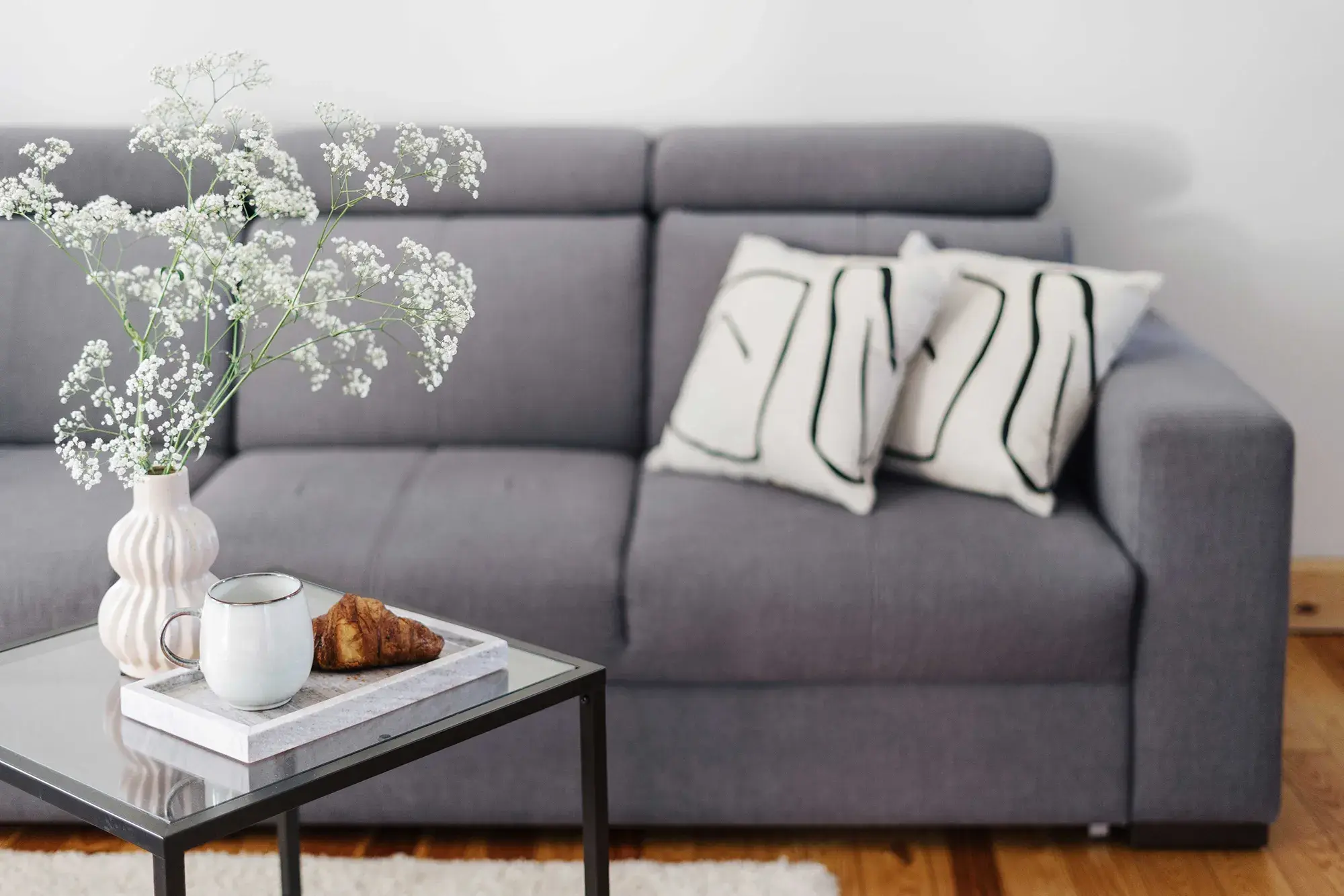 Modern living room featuring a glass coffee table, highlighting custom glass craftsmanship, with a focus on reflective surfaces and elegant design elements suitable for shower doors, table tops, mirrors, and tempered or beveled glass edges.