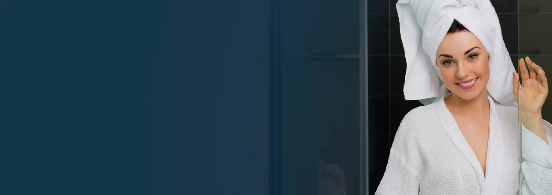 Custom shower doors with textured tempered glass, featuring a woman enjoying a spa-like moment, highlighting the elegance of modern design.