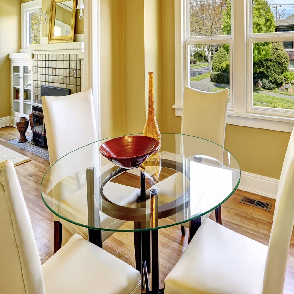This gorgeous 36” Round Tempered Gass Table Top, is perfect for use as a 3/8" thick protective glass top on existing circular tables. For added strength, the glass is tempered, and will not break into dangerous glass shards. Crafted with high-quality tempered glass, it offers both strength and safety while providing a crystal-clear surface for your dining or living area. The 3/8" thickness adds a touch of elegance, creating a sleek and modern look. The flat polished edges enhance the overall aesthetics, providing a seamless and refined finish. Whether you're hosting gatherings or enjoying intimate meals, this table top is the perfect centerpiece. Glass Type: Clear. Shape: Round. Glass Strength: Tempered Glass Thickness: 3/8” thick. Edge Work: Flat Polished.